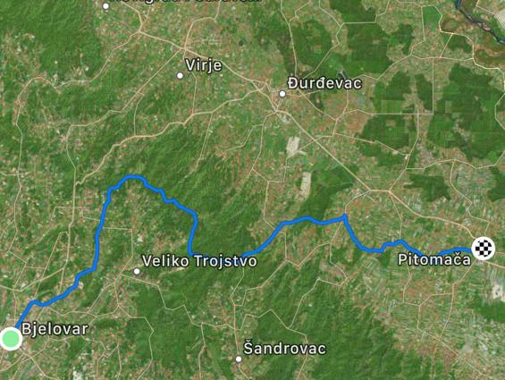 Predviđen dolazak u Bjelovar je u 10.42. Ovisno o dogovoru, moguće kraće zadržavanje u gradu nakon čega slijedi vožnja od otprilike 45 km prema Pitomači. Otprilike pola od toga je makadam. Većina vožnje je po Bilogori, dakle ima i uspona, ali predviđeno je dovoljno vremena za povratak u Pitomaču. Tako da se tempo vožnje može prilagoditi svima.